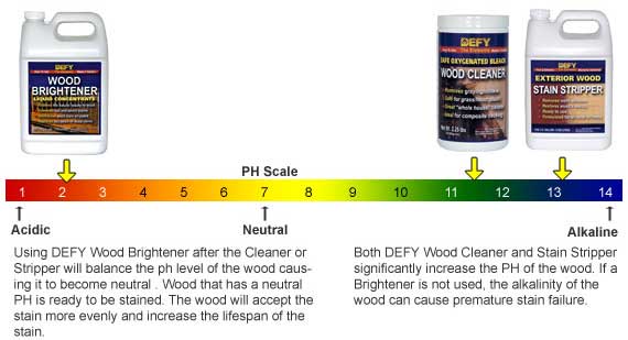 The second step is the use of a wood deck brightener. The brightener will lower the pH balance to a neutral state of 7 on the pH scale. Basically the wood deck brightener cancels out the high alkalinity of the wood deck cleaner/stripper. This is needed prior to applying the wood stain, helping overall stain performance.